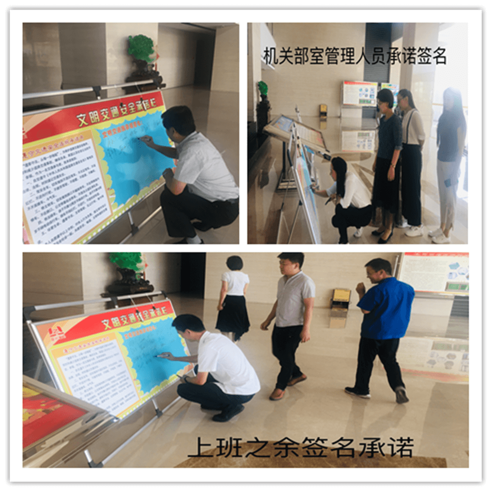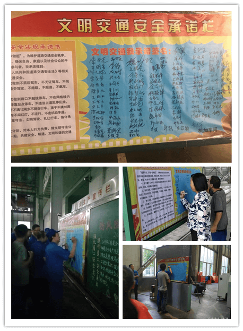 簽訂“遵守交通安全法規(guī)承諾書”。公司制作了“遵守交通安全法規(guī)承諾欄”版面十余塊,擺放在醒目位置,以部門為單位,每位員工在版面上進行簽名承諾。公司總經(jīng)理郭釧帶頭在《文明交通承諾欄》上簽名,其他領(lǐng)導和部門員工也陸續(xù)進行了簽名,通過交通安全承諾簽名,使每位員工時刻提醒自己,履行自己承諾。